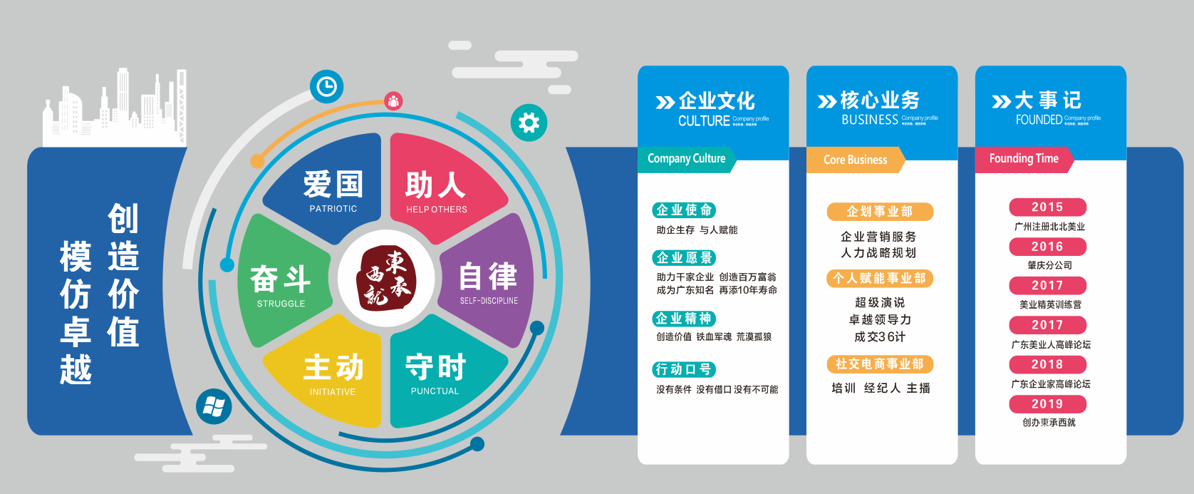 東承西就(廣東)教育信息咨詢服務(wù)有限公司,創(chuàng)辦于2019年8月,由北北美業(yè)(廣州北北商貿(mào)有限公司,于2015年9月在廣州市天河區(qū)注冊)原班人馬從新出發(fā),以企業(yè)服務(wù)和個人賦能為核心業(yè)務(wù)。2020年簽約抖音MCN機(jī)構(gòu),布局社交電商。