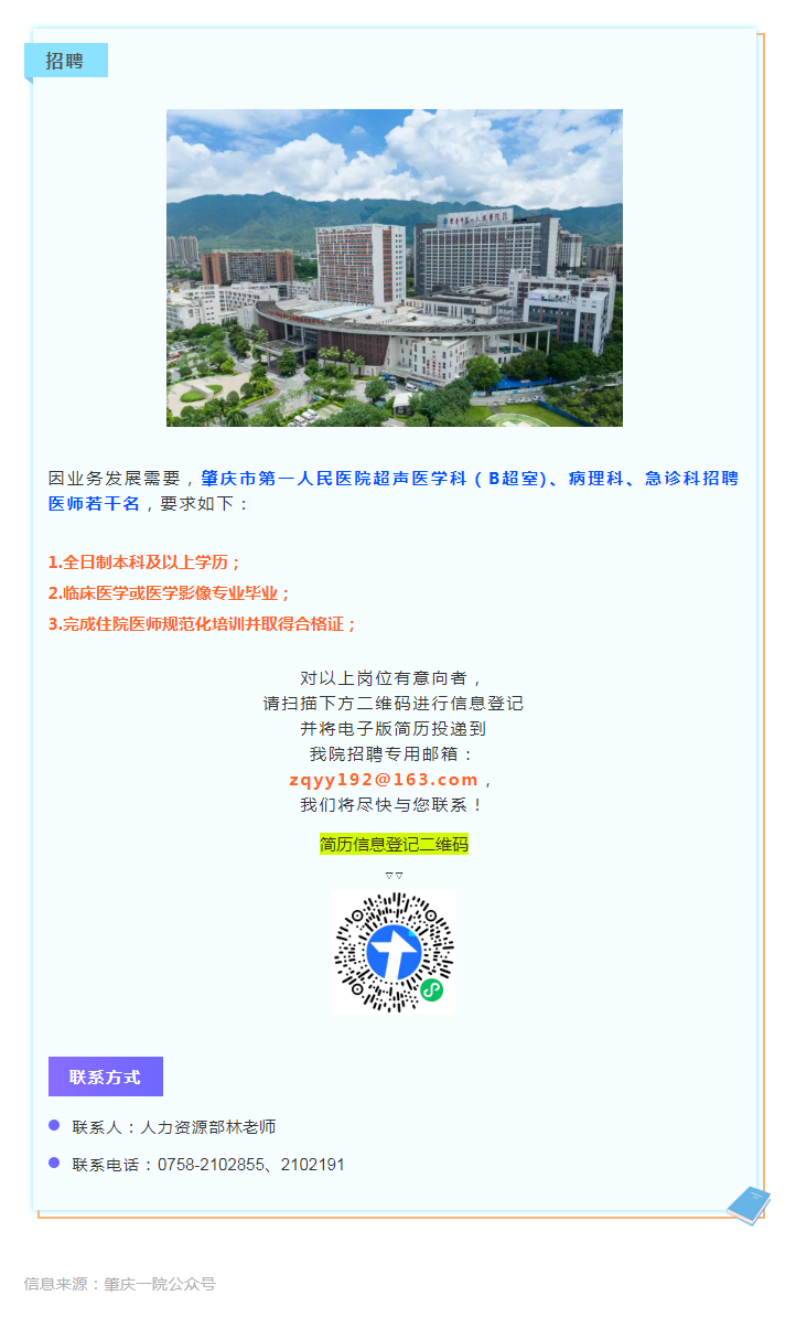 肇慶一院招人啦!誠聘超聲、病理、急診醫(yī)師若干名