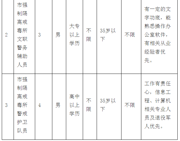 2、市強制隔離戒毒所(以下簡稱:市強戒所)文職警務(wù)輔助人員3名。