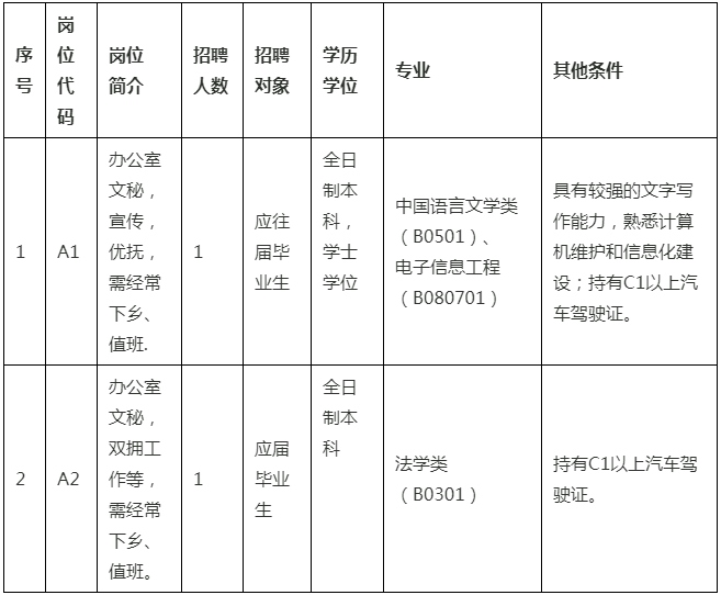 本次共招聘機(jī)關(guān)雇員2名。招聘崗位條件如下: